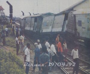 Rangkaian yang anjlok (Bernas, Minggu, 19 April 1992, koleksi Monumen Pers Nasional) Sebuah KA Barang meluncur dari timur, memasuki emplasemen…